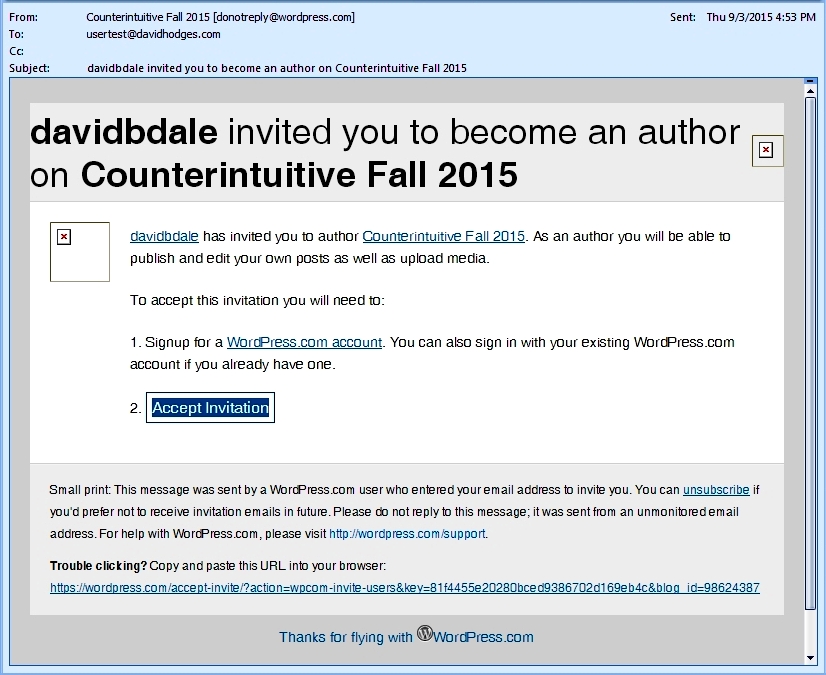 To post your work for class, you’ll need to be an Author at the Counterintuitive Fall 2015 blog, and to accomplish that, you’ll need a WordPress username.