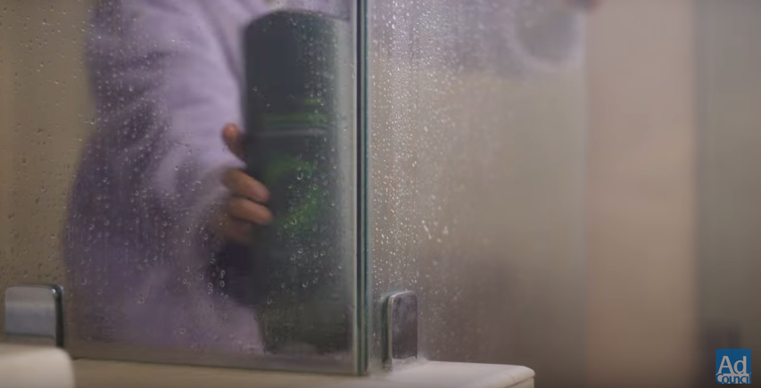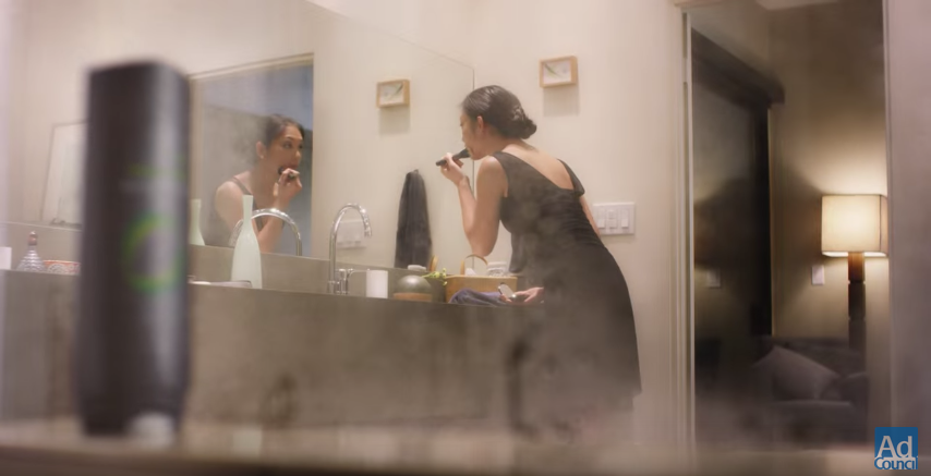00:06 – The time of the advert then switches, once again with the shampoo present. Although to the side, it is very much in focus along with the fogged up glass shower wall. This infers that the bottle was recently used. A woman is present in the background and seems to be applying makeup while wearing more formal attire, maybe getting ready for an event of some sort.