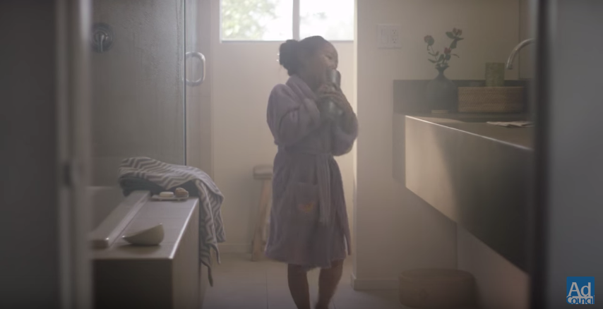 00:11 – The person in the purple bathrobe is revealed to be a young Asian girl, too young to be the woman in the previous scene and not a boy enough to be from the first scene. She has the shampoo bottle in her hands but is not using it for normal shampoo purposes, but instead utilizing just the bottle itself as a microphone stand-in. She is walking through the bathroom, which once again is clearly the same as the setting from the first two scenes. This also appears to take place in the afternoon, judging by the angle the light is coming in through the window.