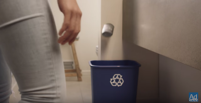 00:25 – A jump cut then skips to the comb next to the sink alone, without the two characters that were just in the room. It is placed in such a way that the recycling symbol is clear and obvious, very reminiscent of the image on the side of the recycling can that the original shampoo bottle was thrown into. The text “Give your garbage another life.” also centers itself across the screen. This tells the viewer that the shampoo bottle was transformed through the magic of recycling into a comb. Despite losing its use as a shampoo bottle, it was revived as a comb.