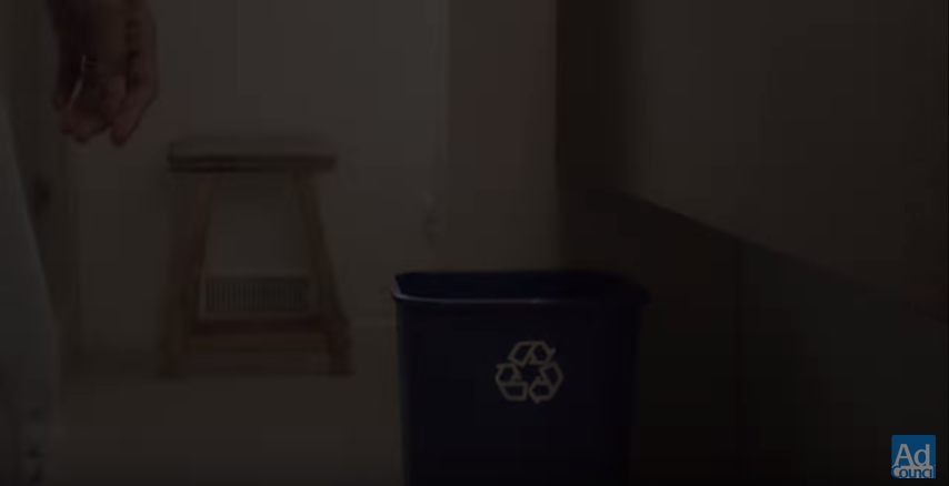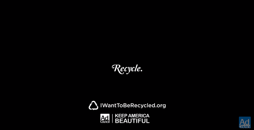 00:28 – The last frame of the advert is a black screen with the word “Recycle.” printed across the middle. It is in italic, very contrasting text that is very clear (white on black is so much nicer than black on white, right?). A website for further information is also given along with the organization Keep America Beautiful from the Ad Council, who put out the advert.
