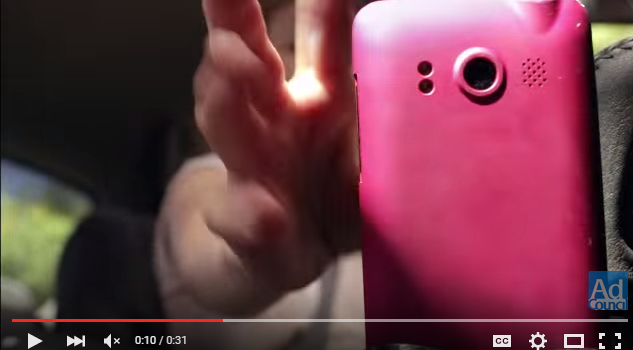 :16- The screen flashes this image before going black once again. The driver is viciously typing on her cell phone. It can be assumed that she is looking only at her phone at this point and not the road.