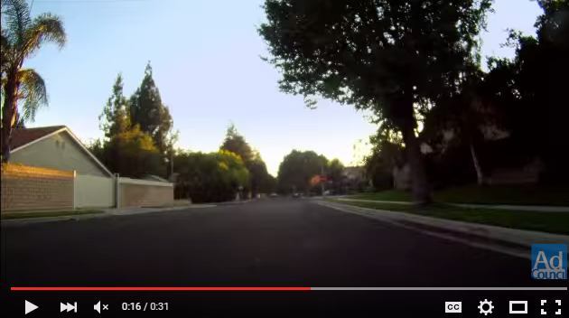 :16- :17- Another image appears for only half a second before flashing back to black. The car continues going down the residential road. Judging by light placement on the wall and trees to the right it can assumed that it is early in the morning or dusk.