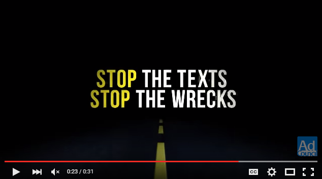 :23- :24- “Stop the wrecks” appears under the other message. The message of this commercial becomes clear; texts can wait. Do not text and drive.