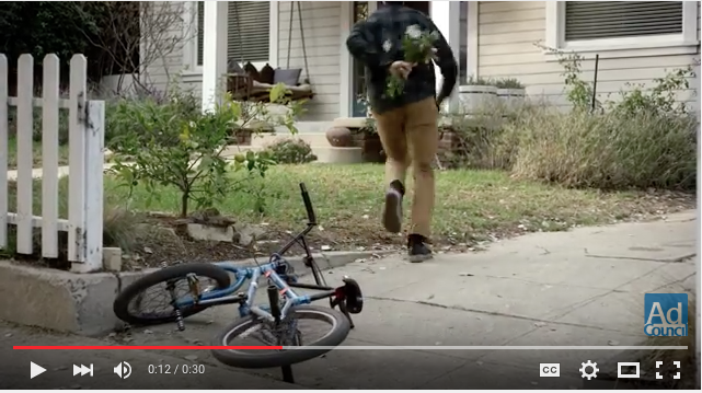 00:12- He rode his bike and dropped it to the curb. He runs to a house with flowers behind his back supposedly to give to a girl.