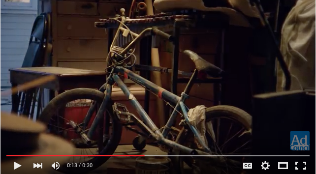 00:13- The bike is put to the side in the garage where the boy had once received it as a birthday present. In the background a car engine is heard, implying that the boy is grown up and has a car.