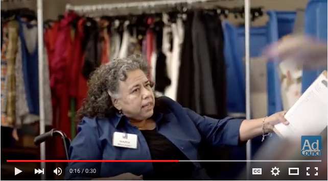 00:16- Now in a goodwill store a woman points to direct someone to put the bike somewhere.