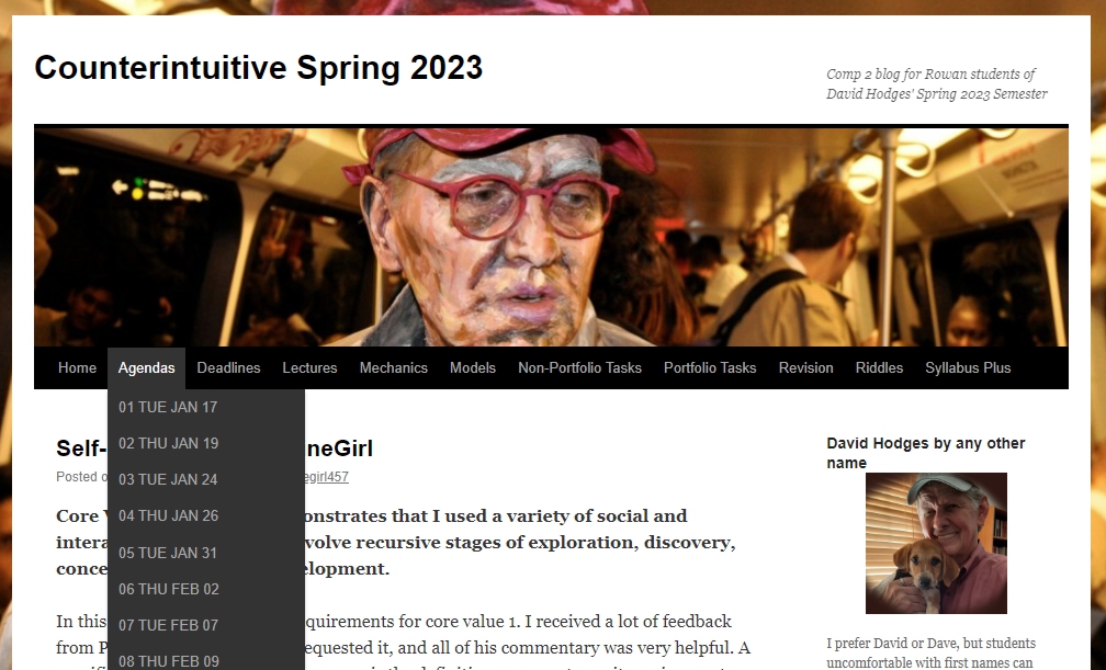 THE COURSE IS CONDUCTED ON A BLOG. On the first day of class, you’ll sign up for a free WordPress account and join the course blog, Counterintuitive Spring 2023